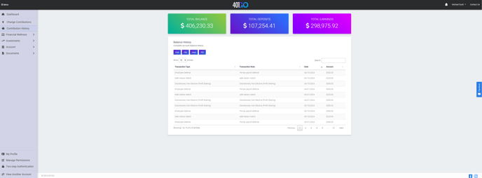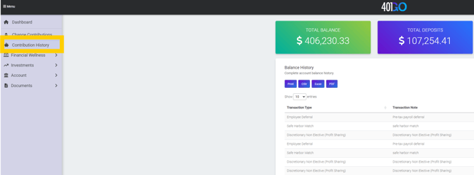 The Contribution History provides a detailed record of funds contributed, distributed, rolled over and transferred, and dividends earned. Any fees deducted from the assets are also displayed in this section.