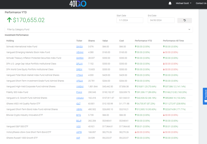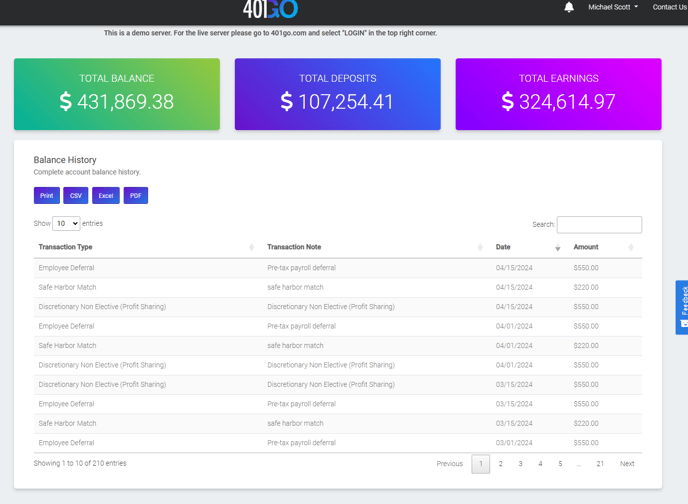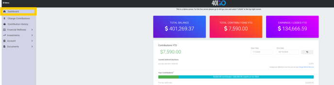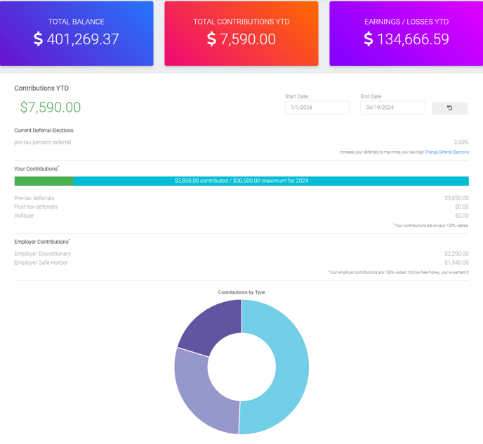 Here you can see your total balance, recent payroll uploads, total contributions YTD, employer contributions, earnings/losses YTD, plan details and more.