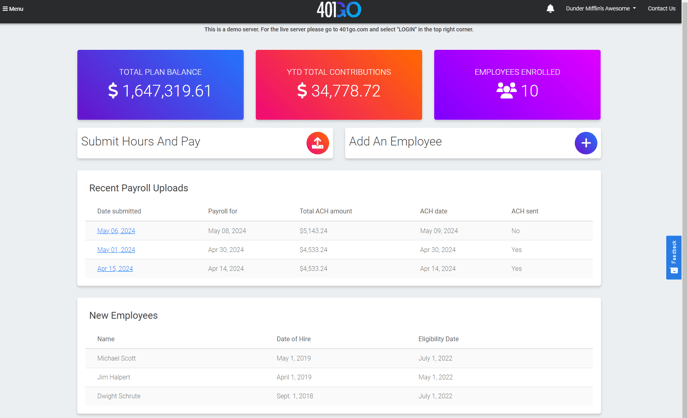 This page is the home base of your company’s 401(k) plan. Here, you can see information for recent payroll uploads, new employees and plan details.