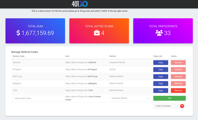 - Manage Referral Codes: Allows the partner to manage email invites that go to clients looking to start or convert their retirement plans. These specific links allow the partner to embed their advisor pricing and 3(38) option. If you would like to embed a this link into a email outside the website, client on "Copy" and this will allow you to paste the link inside the email that is drafted outside the 401GO website. You can also remove referral code if it will no longer apply to future campaigns.