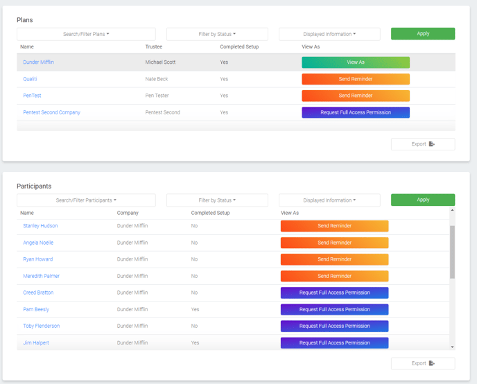 - Plans: This section defaults to reflecting all your Company, Trustee, Completed Setup, and View As information. However, you can simply update your view by clicking on "Displayed Information" There are multiple displays options to choose from. You can also filer by plan name and/or different plan statuses.