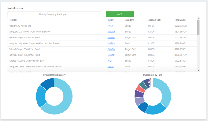 - Investments: The default setting it break down all AUM into each fund. You can filter this view either by company or by participant. This section displays the fund name, ticker, category, expense Ration, and total value in each fund. If you click on the ticker, a new tab will open up with the link to additional fund information. The graphs below also reflect investments broken down by category and also by investments by fund.
