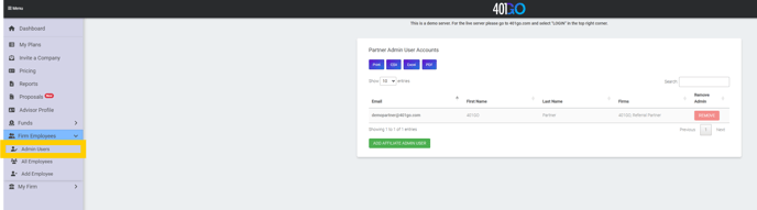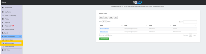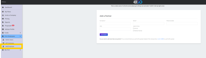 "Add Employees" allows you to add or edit partner users who are advisors of your firm that would get advisor comp from 401GO plans. You can add or remove partner from this screen.