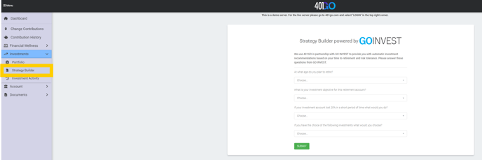 The Strategy Builder is designed to assist you in reaching your retirement goals. By answering the provided questions, you will receive personalized suggestions on how to achieve your desired financial objectives. (May not be available for all participants.)