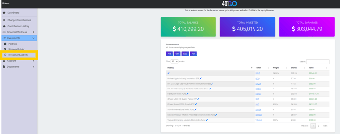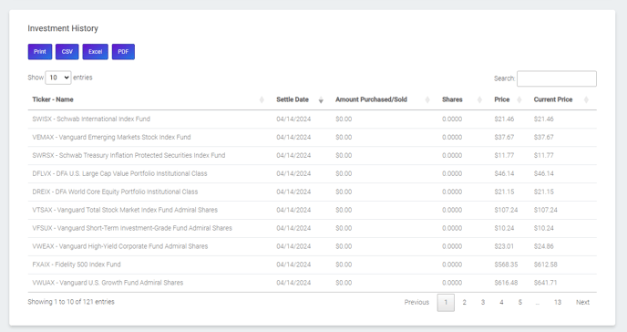 The Investment Activity option provides a comprehensive overview of your investments. By clicking on the blue pencil icon, you can easily access your portfolio to make changes to your investment selections without having to navigate back to the main menu. Additionally, clicking on the blue highlighted Ticker will direct you to a website to view detailed information about a specific investment. This section also displays your investment history. You can choose to print or download this information in various formats by clicking on the corresponding blue squares.
