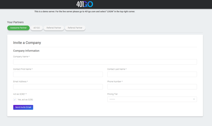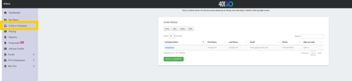 "Invite a Company" allows you to send out an email directly to your client prospects that auto generates the link for them to set up a 401GO retirement plan. It allows you to select if your firm would like to act as a 3(38) and control advisor pricing.