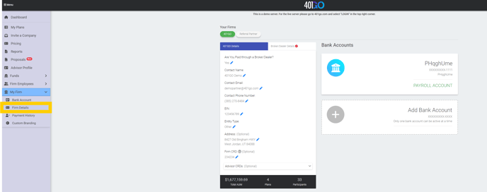 "Bank Account" allows you full control to add and update your payee information for your firm.