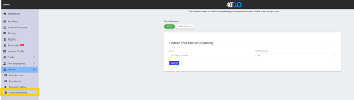 "Custom Branding" allows your firm to reflect your logo and choose top menus color to be reflected on your clients website. Simply upload your logo and select the color options and "Submit"