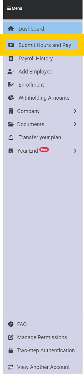 - Navigate to Menu > Dashboard and click the Submit hours and pay button
