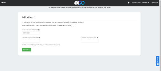 When you submit payroll data in 401GO, you will reference the pay date or check date for the payroll. In this example, it is the last day of the month. You can add the payroll start and end dates, but this is not required.