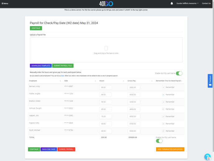 If you have employees who are salaried/paid the same amount each pay period, you can select the Remember box and the system will automatically fill in the same information the next time you submit payroll in 401GO.