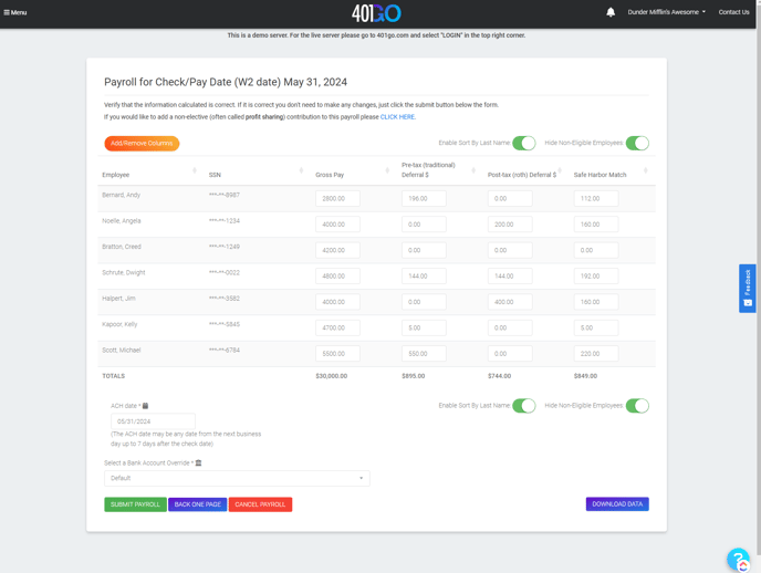 If the deferrals listed on this page are correct you can scroll down and click Submit Payroll. If any of the information is incorrect, update it to match your payroll record. The employee deferral information must match payroll, as that is what will be reported on the employee’s W2.