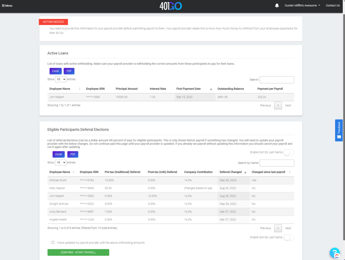 If you have had any employee contribution changes since the last payroll, navigate to the withholding amounts page, review the list for changes and ensure they are up to date in payroll before continuing. Once you have done this, check the box, “I have updated my payroll provider with the above withholding amounts” and click Confirm - Start Payroll.