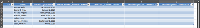 When you download the payroll file, it will save as an Excel file. Update the information for each column to match payroll information. The columns are: