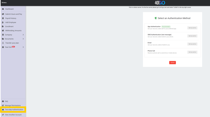 After you've set up your 401GO administrator account, you'll be asked to establish two-factor authentication. You must authenticate each time you login to 401GO.