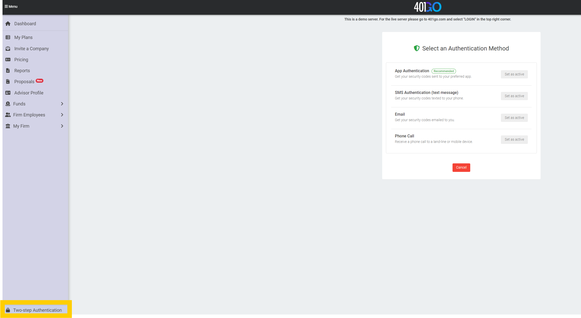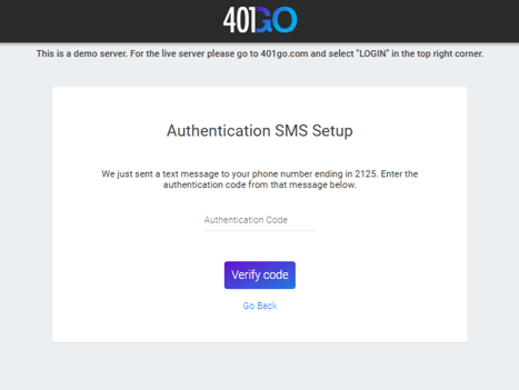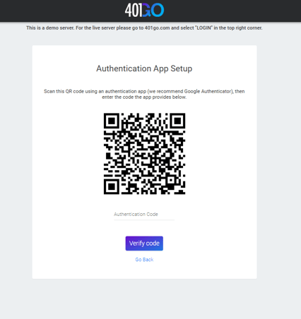 After you've set up your 401GO partner account, we highly recommend setting up your two-factor authentication. You'll be asked to authenticate each time you login to 401GO.