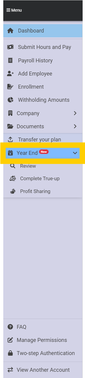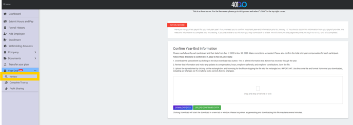 At the end of each year, you need to complete a review for data submitted to 401GO. Navigate to Menu > Year End.
