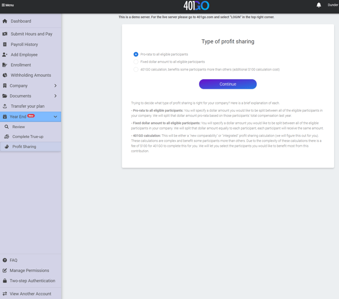After your end-of-year review and true-up are complete, you will have the option to submit a profit share. You may select pro-rata, fixed dollar amount or a new comparability profit share.
